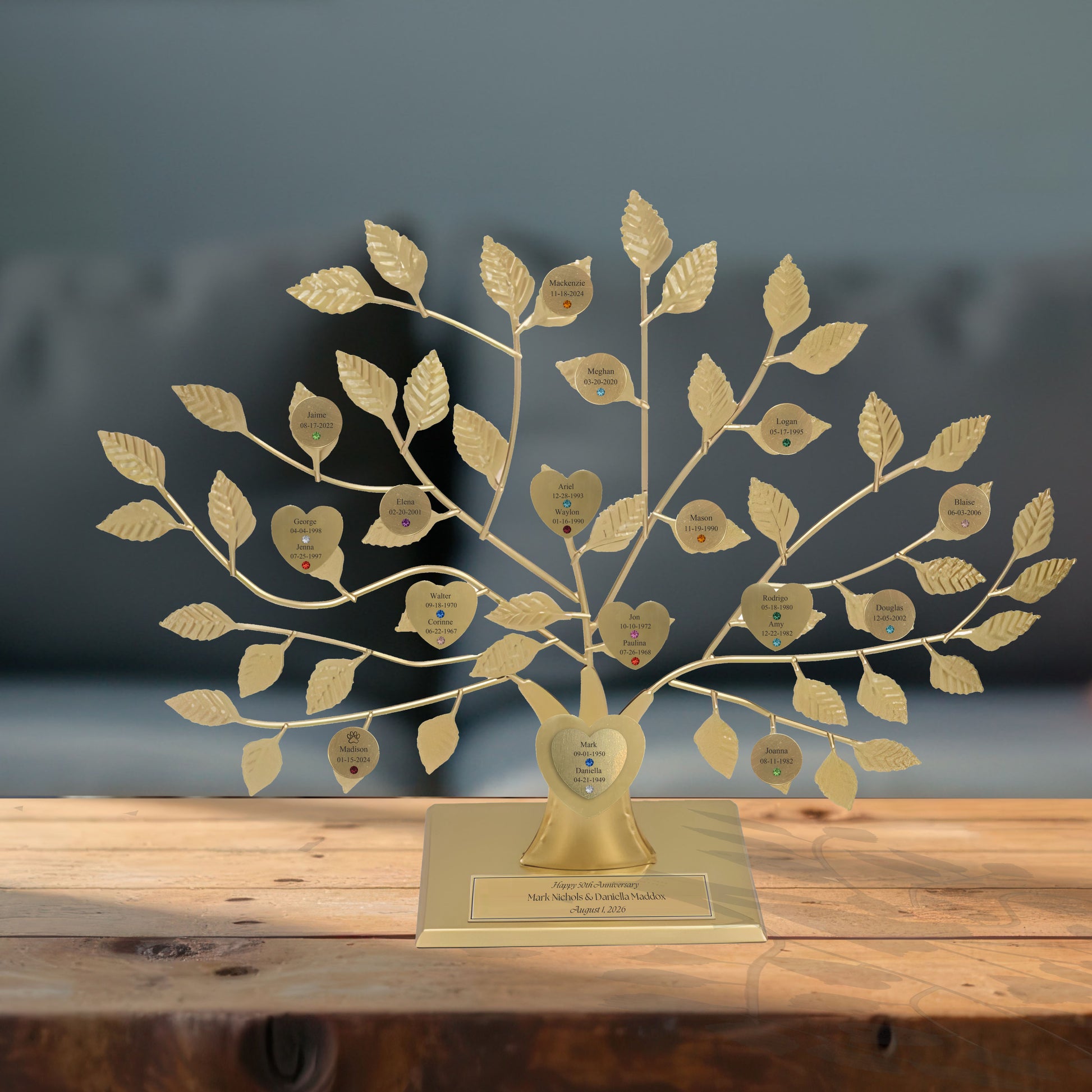 Celebrate the unbreakable bonds of family with our elegant Anniversary razortree. The forged silver gold showcases the engraved and jeweled double heart design for the couple and the elegant magnetic hearts and discs for their family. A commemorative plaque with the anniversary date completes this family heirloom. An exclusive and tasteful gift for any anniversary celebration.