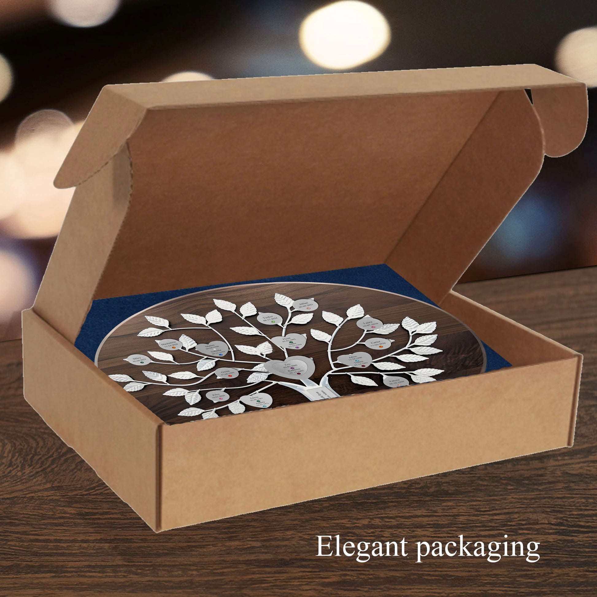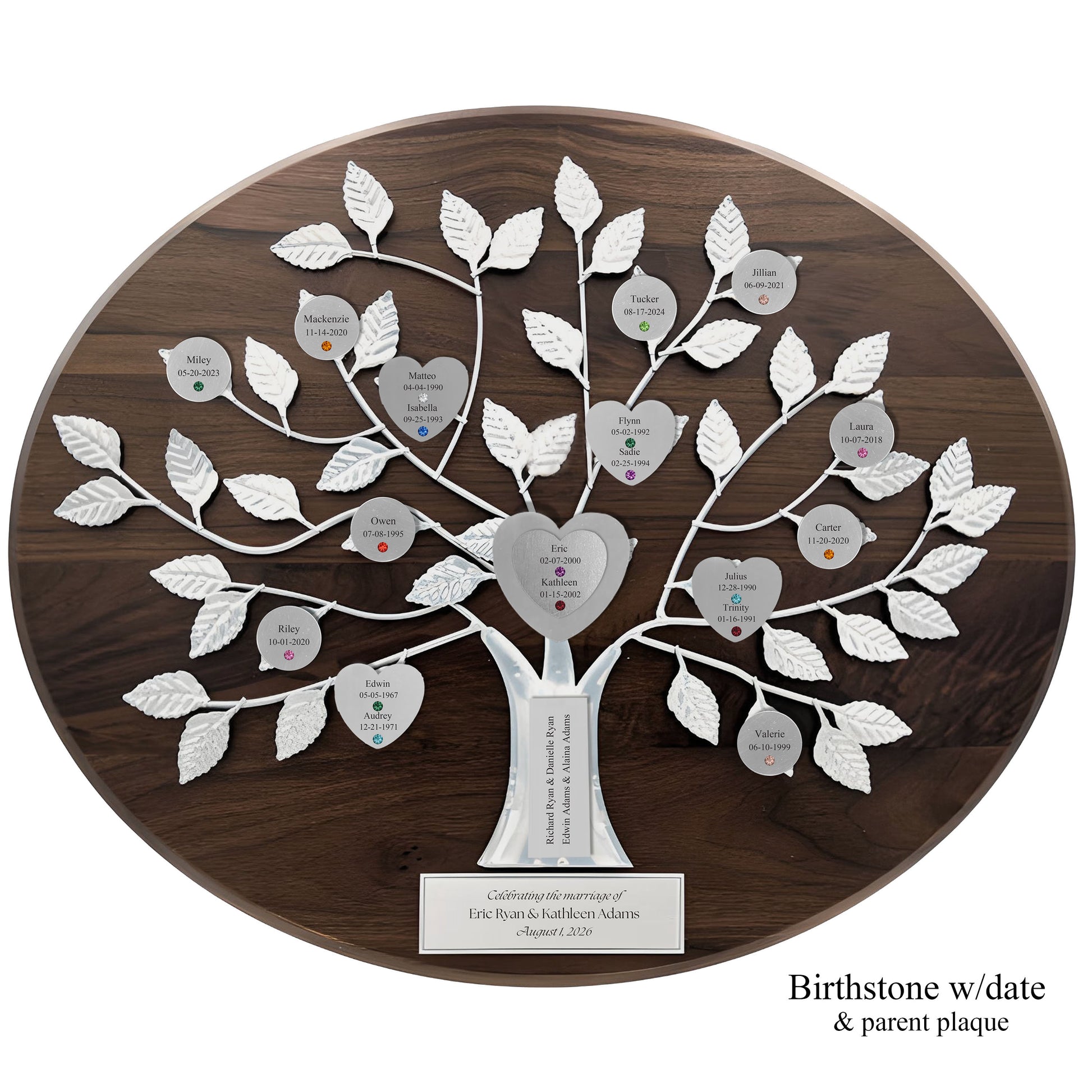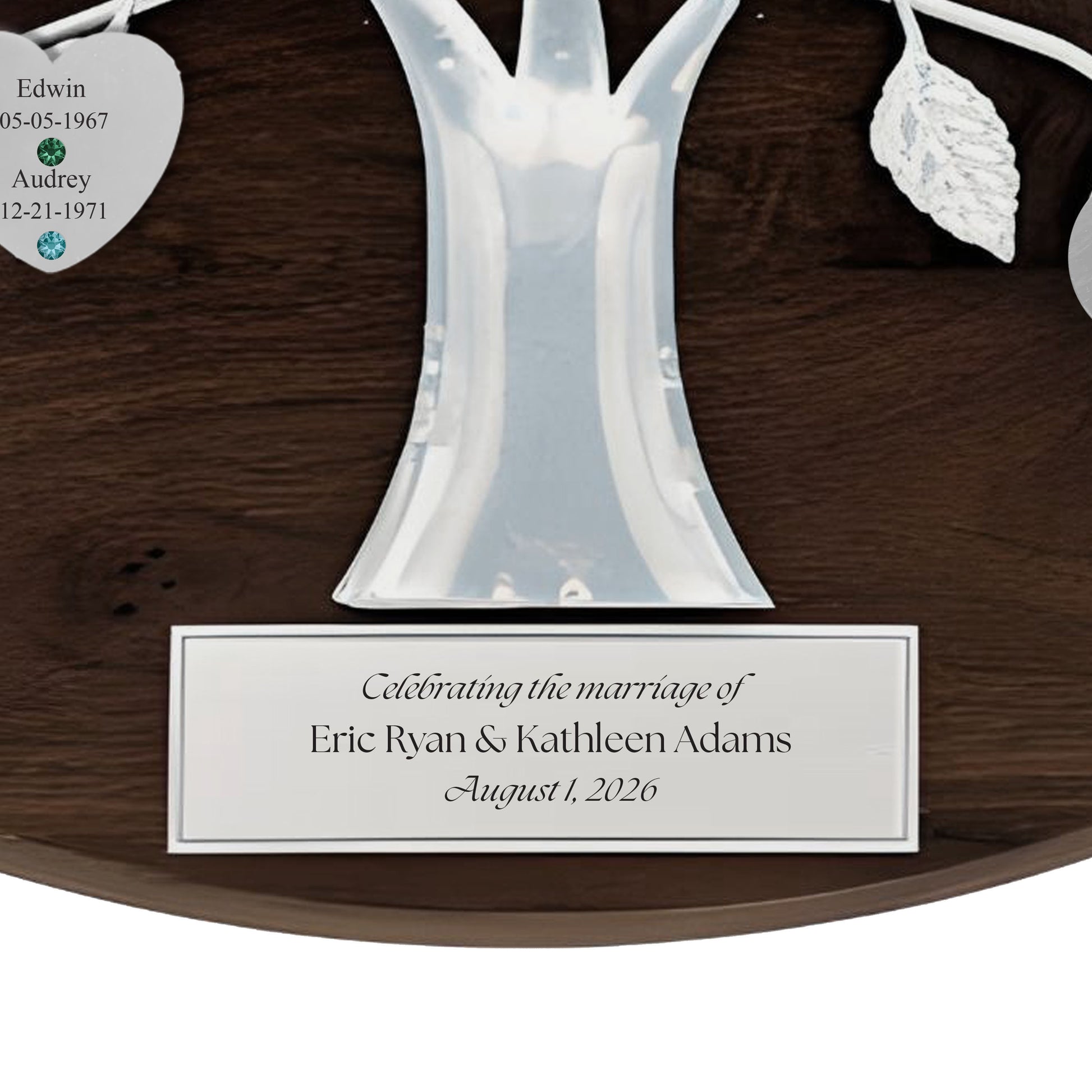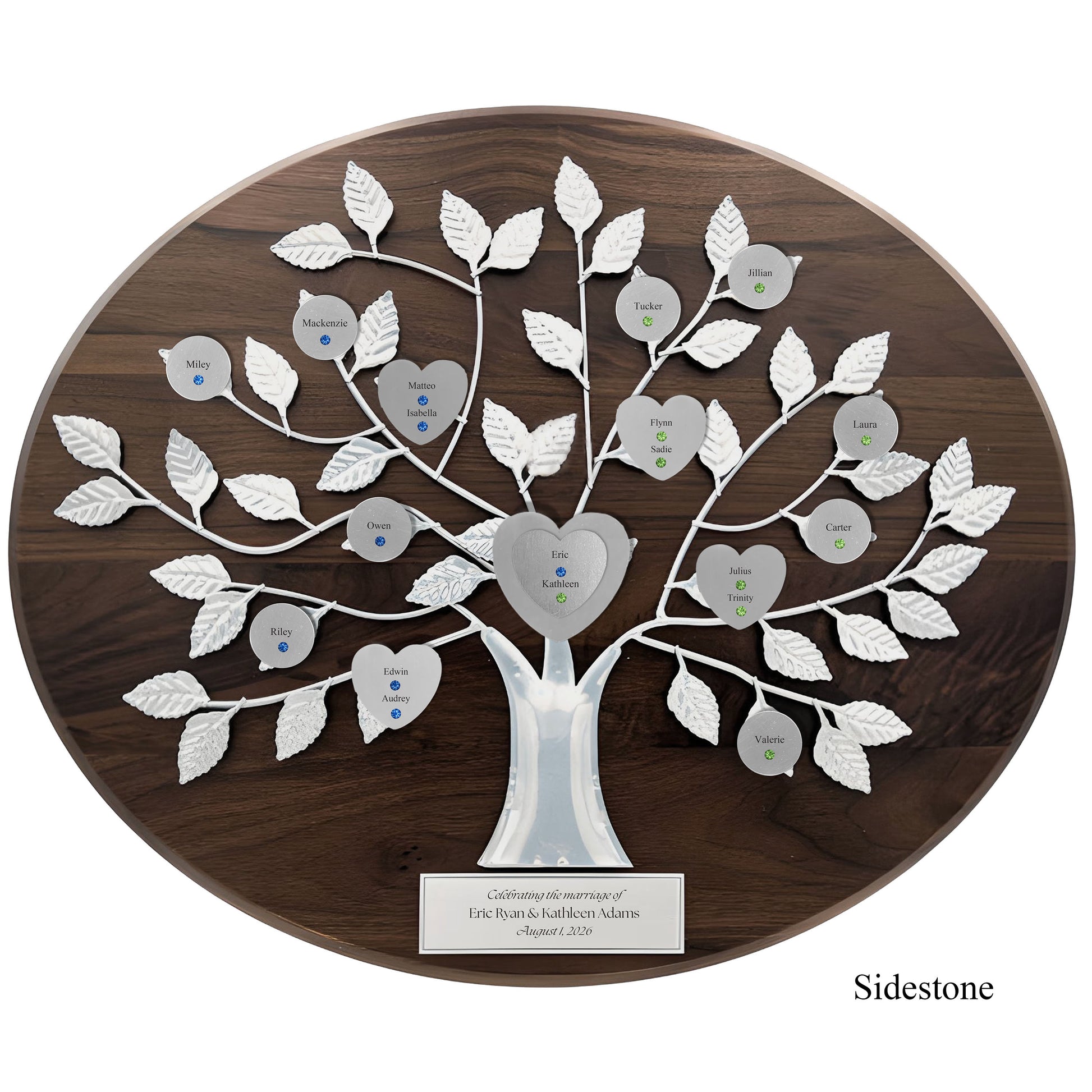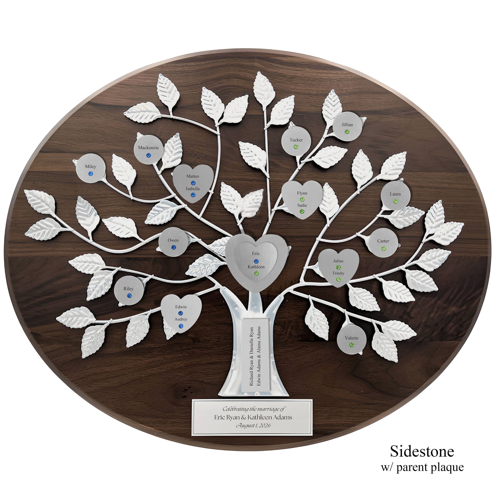 Commemorate the union of two hearts and two families with our exquisite Wedding razortree. The solid walnut base and forged silver tree showcase the engraved and jeweled double heart design for the newlyweds and the elegant magnetic hearts and discs for their family. A commemorative plaque for the wedding date and a optional plaque for the parents of the bride and groom complete this family heirloom. Display or hang this timeless memento. An exclusive and tasteful addition to any wedding celebration.